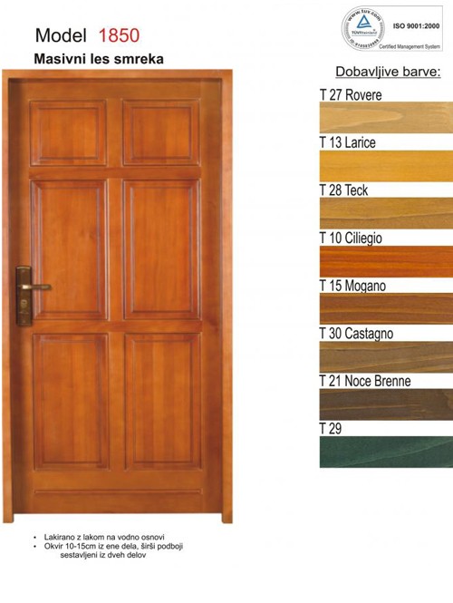 Krilo in podboj vrat sta v celoti izdelana iz masivnega lesa, ki se luži v barvni odtenek po izboru.